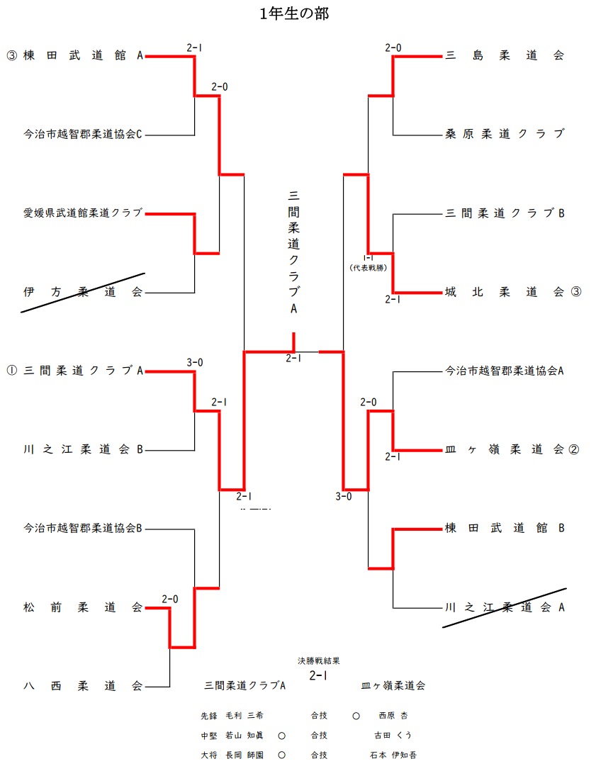 第50回愛媛県少年柔道錬成大会(団体試合) 試合結果 ホーム > 令和5年度大会一覧 > 第50回愛媛県少年柔道錬成大会(団体試合) 試合結果 令和5年度 令和4年度 令和3年度 令和2年度 1年生の部2年生以下の部 3年生以下の部4年生以下の部 5年生以下の部6年生以下の部 ■ 試合結果(PDF)のダウンロード 1年生の部 試合結果 2年生以下の部 試合結果 3年生以下の部 試合結果 4年生以下の部 試合結果 5年生以下の部 試合結果 6年生以下の部 試合結果 令和5年度(第50回)少年柔道錬成大会記録(団体試合)